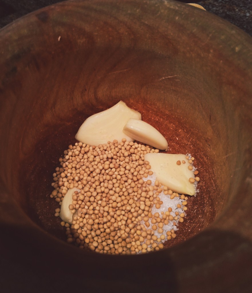 - En un mortero, machacamos el diente de ajo junto con las semillas de mostaza y la sal.