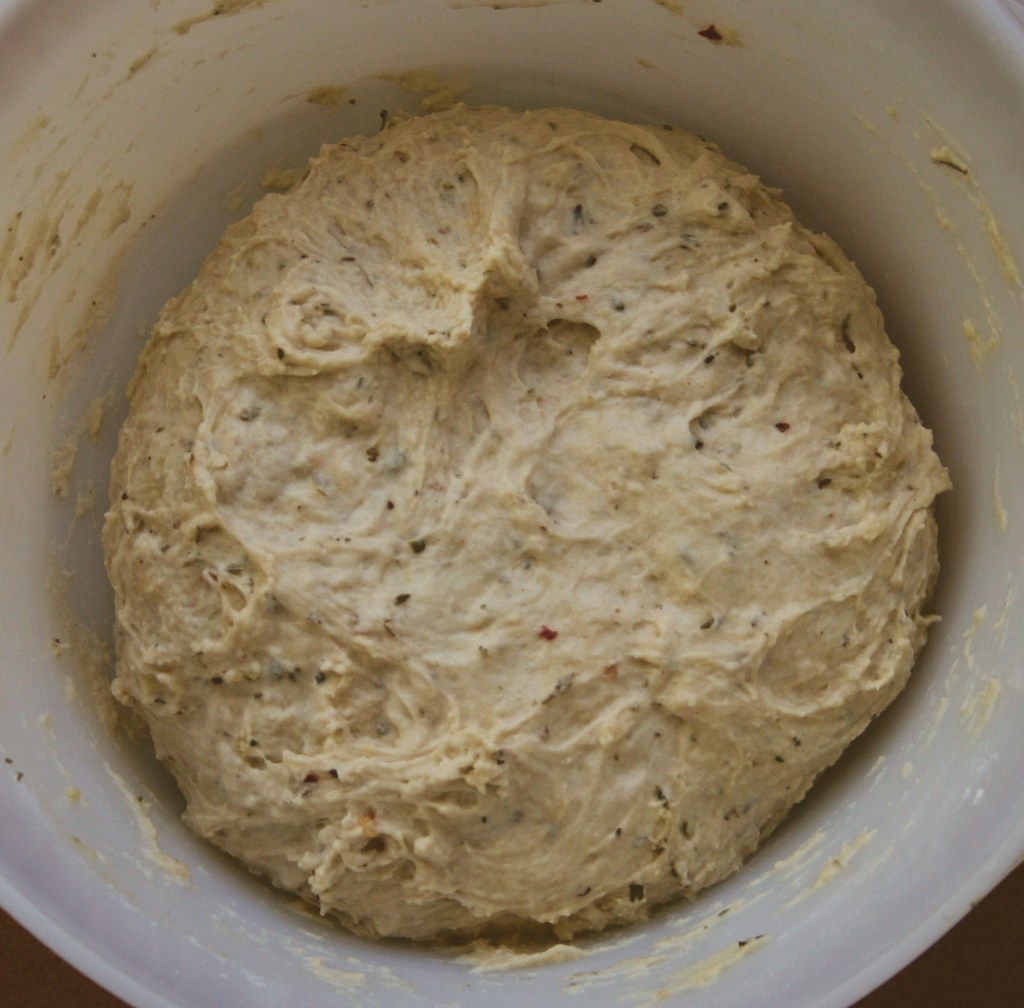- Incorporamos los ingredientes húmedos, primero la masa madre, después el vino y finalmente el aceite, mientras vamos mezclando.