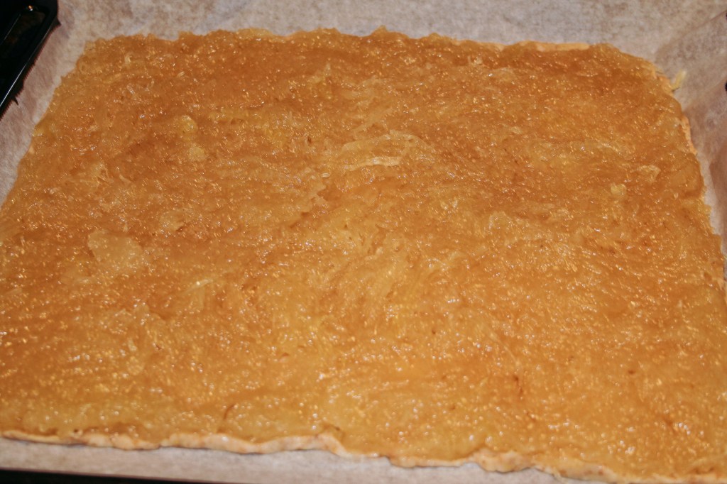 - Distribuimos el cabello de ángel sobre el rectángulo que está sobre la bandeja del horno.