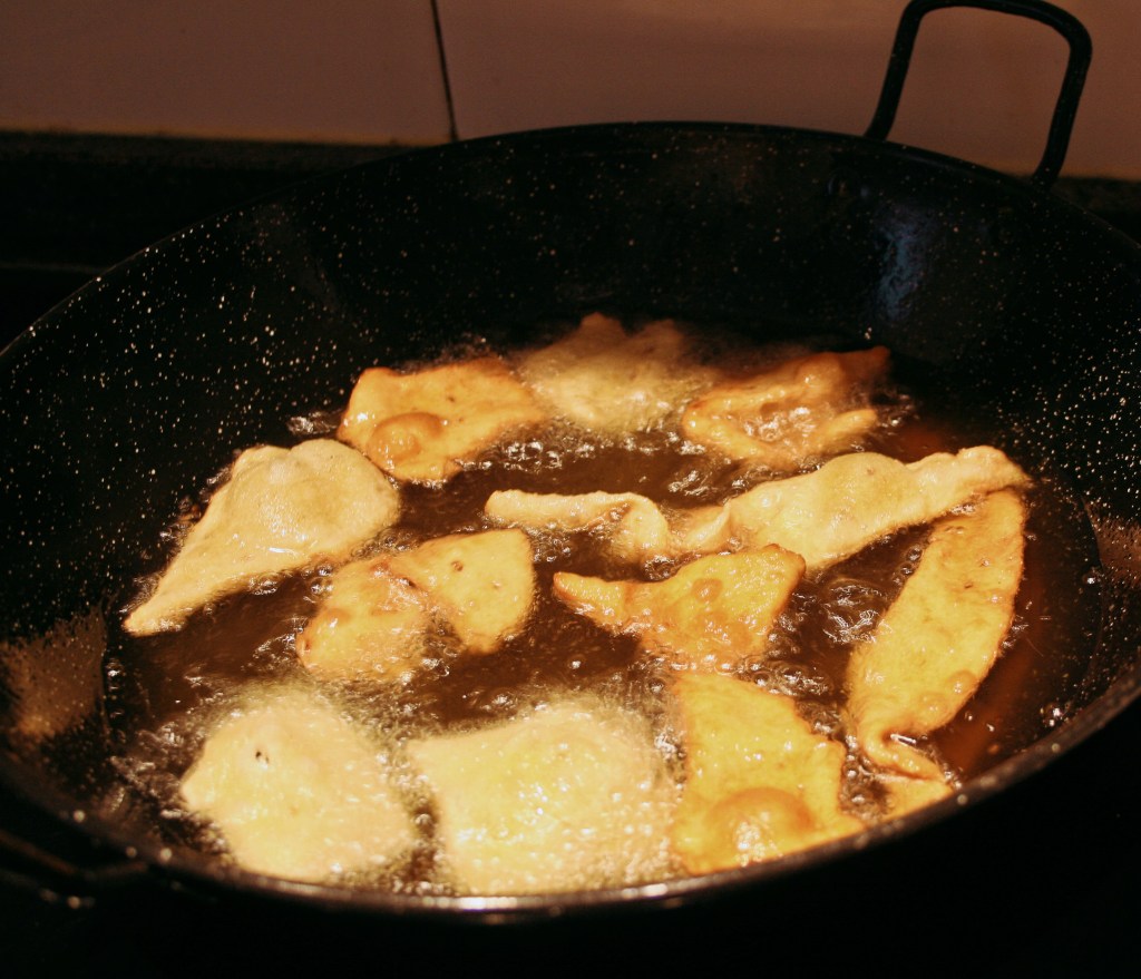 - Preparamos una sartén de fondo alto para freír, y añadimos aceite suficiente para que los pestiños floten, evitando que toquen el fondo, pues se quemarían.