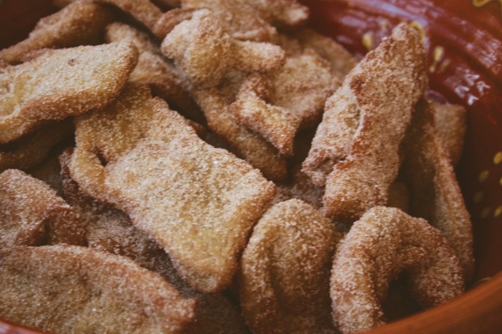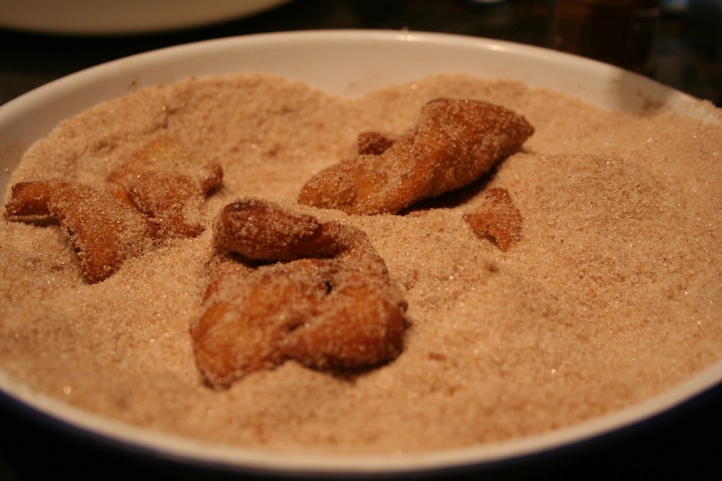 - La primera mitad de pestiños que saquemos van a ser los de azúcar. Para rebozarlos (o emborrillarlos, como se dice en Almadén), se pasan por una mezcla de azúcar y canela, cuando todavía están calientes.