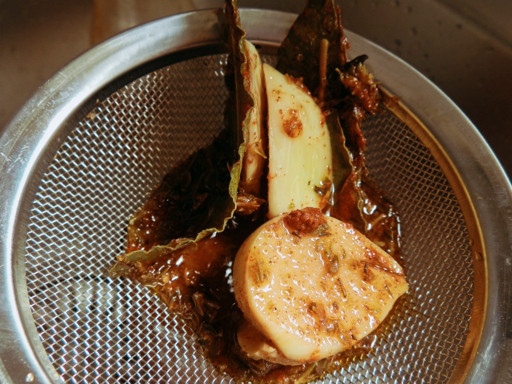 - Para no desperdiciar nada, vamos a preparar también un pan, para lo que retiramos las hojas de laurel. El resto, los ajos y las hierbas que hemos colado, los trituramos hasta obtener una pasta fina.