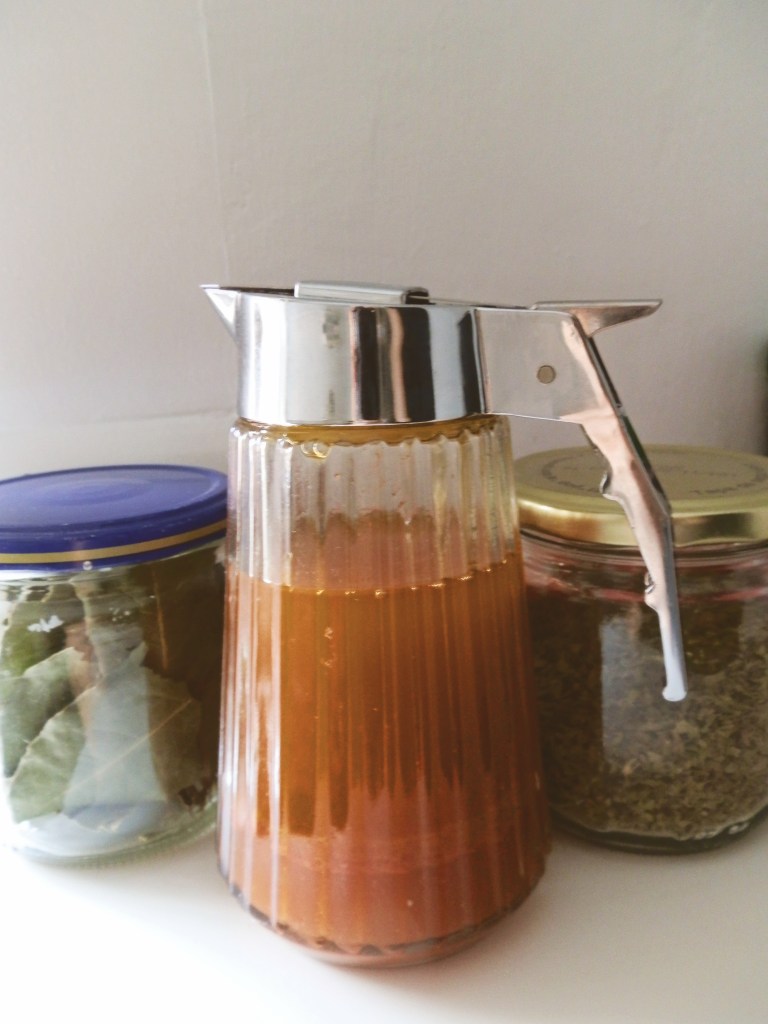 - En un bote de vidrio, introducimos los ingredientes líquidos, las hierbas, las especias, la sal y los ajos.
